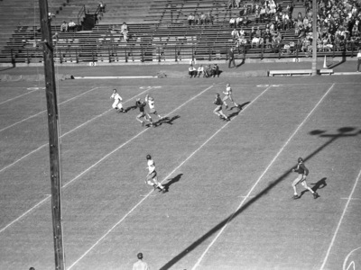 The Texas Christian University Horned Frogs are facing the rival Baylor Bears at Municipal Stadium in Waco, Texas. The Frogs' offense was clicking early in Waco. Fullback Frank Kring (30 in the dark jersey) is shown catching the pass thrown by Emery Nix. Bear Bill Coleman (47) fought for the ball and managed to tip it off his fingers before Kring secured the catch and scored a sixty yard touchdown. T. C. U. went on to win the game 23-12. Published in Fort Worth Star-Telegram, morning edition, November 2, 1941.