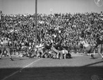 The Texas Christian University Horned Frogs are facing the rival Baylor Bears at Municipal Stadium in Waco, Texas. During a kick return the Frogs' powerful fleet sophomore halfback, Van Hall (22), tore loose for a long run on kickoff return in Waco. He shot through a flock of Bears but was finally brought down after a thirty-yard scamper. The Frogs blockers clearing the way are Mike Harter (62), Ronnie Brumbaugh (81), Frank Medanich (10), and Emery Nix (84). The Baylor player coming across the field is Bill Coleman (47). T. C. U. went on to win the game 23-12. Published in Fort Worth Star-Telegram, evening edition, November 3, 1941.