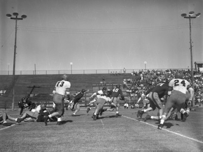The Texas Christian University Horned Frogs are facing the rival Baylor Bears at Municipal Stadium in Waco, Texas. Frog halfback Emery Nix (48 dark jersey) is shown running with the ball as Bear Bill Coleman (47) whiffs on the tackle. Nix was effective running the ball, but even better throwing the deep ball. He marked up 337 yards through the air and T. C. U. won the game 23-12. Published in Fort Worth Star-Telegram.