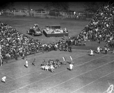 The Southern Methodist University Mustangs are hosting the University of Texas Longhorns at Ownby Stadium in Dallas, Texas. The Longhorns displayed a variety of ways to score during Saturday's game. Their second touchdown came on a two yard run from back Pete Layden (31). He is shown in the middle of a pile of defenders at the edge of the goal line. The Longhorns went on to win the game 34-0. Published in Fort Worth Star-Telegram, morning edition, November 5, 1941.