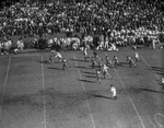 The Southern Methodist University Mustangs are hosting the University of Texas Longhorns at Ownby Stadium in Dallas, Texas. Fine passing and great running makes the Longhorns the most dangerous offensive team of the 1941 season. An example of their expert blocking came on a punt return. Might back, Jack Crain (44) is shown in full stride. He brought the ball from his own twelve to the forty-four yard line. One of the blockers leading the way for Crain is Zuehl Conoly (70). The Longhorns went on to win the game 34-0. Published in Fort Worth Star-Telegram, evening edition, November 14, 1941.