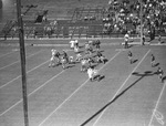 The Texas Christian University Horned Frogs are facing the rival Baylor Bears at Municipal Stadium in Waco, Texas. The Frogs came out of the gate strong, and never relinquished the lead. Their strong defense is shown bringing down the Bears' star back Jack Wilson (white jersey, 41) after a four yard gain. The Frog defenders are Woody Adams (70), Darrell Palmer (71), Phil Roach (80), Frank Medanich (10), Emery Nix (48), and Frank Kring (30). The Frogs went on to win the game 23-12. Published in Fort Worth Star-Telegram, morning edition, November 5, 1941.