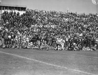 The Texas Christian University Horned Frogs are facing the rival Baylor Bears at Municipal Stadium in Waco, Texas. The Frogs came out of the gate strong and never relinquished the lead. Their defense stood strong against the Baylor ground game. Bear back, Bill Coleman (white jersey, 47) is shown attempting to run the ball. Four Frog defenders gang-tackled Coleman. Other Frogs in the picture are Jim Woodfin (56), John Bond (34), Mike Harter (62), and Darrell Palmer (71). The Frogs went on to win the game 23-12. Published in Fort Worth Star-Telegram, morning edition, November 5, 1941.