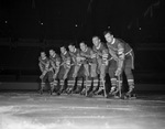 The Fort Worth Rangers are a minor professional ice hockey team in the American Hockey Association (A. H. A.). The Rangers play their home games at Will Rogers Memorial Coliseum and are preparing for the 1941-1942 season. Seven of the Rangers who will face the St. Paul club in the opening game, left to right, are Pete Leswick (wing), Pete Pleban (wing), Bert Connolly (wing), Gene Carrigan (coach and center), Bert Peer (wing), Ross Knowles (defense), and Lloyd Jackson (center). They are dressed in their uniforms, skates, and gloves, and are carrying their hockey sticks.