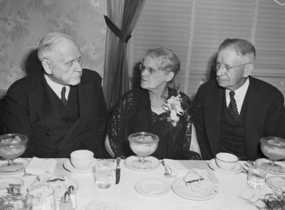 Prominent Baptists dined together when trustees of Southwestern Baptist Theological Seminary gave an appreciation dinner for faculty members, administrative employees and their wives. In attendance were Doctor George W. Truett, president of the trustees, Mrs. L. R. Scarborough, wife of the president of the seminary, and and Doctor Scarborough. They are seated at the speaker's table. Doctor Truett and Doctor Scarborough are wearing suits and Mrs. Scarborough is wearing a dress and necklace. She and Doctor Scarborough are wearing eyeglasses. On the table are cups, plates and utensils.