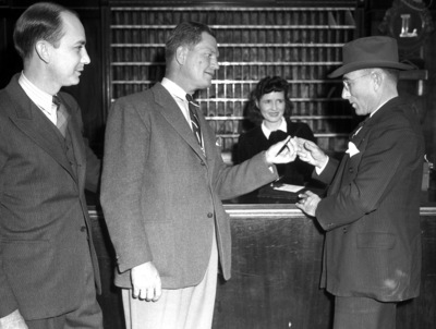 The West Texas Chamber of Commerce (W. T. C. C.) is holding their fall convention in Midland, Texas. Attending the convention, left to right, are J. B. Crain, Dan Hudson, and H. Y. Overstreet. Mr. Crain and Mr. Hudson are on the Midland Housing Committee. They are registering Mr. Overstreet, a delegate from Texico, New Mexico. Mr. Crain is wearing three-piece suit. Mr. Hudson is dressed in a collared shirt, necktie, trousers, and a sports coat. Mr. Overstreet is dressed in a hat and a double breasted suit. An unidentified woman is standing behind the counter.