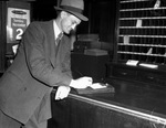 The West Texas Chamber of Commerce (W. T. C. C.) is holding their fall convention in Midland, Texas. In attendance is S. C. Harrison of Memphis, Texas. Mr. Harrison is the director of the W. T. C. C. He is shown registering at the front desk. He is dressed in a hat and a suit. There is a calendar, reading Sunday, November 2, hanging on the wall. Behind the counter are filing compartments.