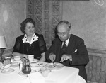Before the 75th annual Central Texas Methodist Conference session opening at First Methodist Church, Bishop Ivan Lee Holt (right) has breakfast with his wife in the Westbrook Hotel coffee shop. The couple is sitting at a table with several plates and cups in front of them. Mrs. Holt is looking over at her husband and smiling. Bishop Holt is cutting a piece of food on his plate. He is wearing a suit and his wife is wearing a floral detailed blouse.