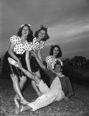 Misses June Knepper, Doris Belle Hill and Emily Stedman shown "kidnapping" Clyde Pemberton Junior for the Sadie Hawkins dance that the Sigma Omicron Sigma sorority will host at the Fort Worth Woman's Club. Mr. Pemberton is lying on the grass as Miss Knepper and Miss Hill grab his right leg and arm. Miss Stedman is kneeling behind Mr. Pemberton's head and has her arm around his neck. The girls are wearing identical polka-dot blouses and dark skirts. Mr. Pemberton is wearing striped overalls and a flannel shirt.