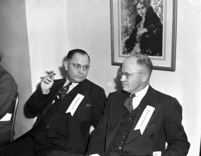 The West Texas Chamber of Commerce (W. T. C. C.) is holding their fall convention in Midland, Texas. Chatting during a recess from policy-making, left to right, are delegates G. C. Dunham and H. S. Hilburn. Mr. Dunham is the mayor of Big Spring, Texas. He is dressed in a three-piece, pinstripe suit. Mr. Hilburn, of Plainview, Texas, is wearing a three-piece double breasted pinstripe suit.