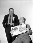 The West Texas Chamber of Commerce (W. T. C. C.) is holding their fall convention in Midland, Texas. Reading a magazine during a recess from policy-making, left to right, are Henry Teubel and Oscar Greene. They are looking over a copy of the West Texas Today magazine. Mr. Teubel is a delegate from Tulia, Texas. He is dressed in a dark suit. Mr. Greene is a delegate from Roswell, New Mexico. He is wearing a suit. Both men are smoking cigars.