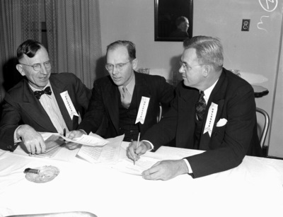 The West Texas Chamber of Commerce (W. T. C. C.) is holding their fall convention in Midland, Texas. Chatting during a recess from policy-making, left to right, are J. M. Willson, Carlton B. Downing, and Galen H. McKinney. Mr. Willson, of Floydada, Texas, is a delegate-at-large at the convention. He is dressed in a suit with a bow tie. Mr. Downing, of Albany, Texas, is the District Five director. He is wearing a three-piece suit. Mr. McKinney, of Fort Worth, Texas, is a delegate-at-large at the convention. He is dressed in a three-piece suit with a pocket square.