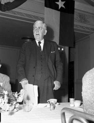 The West Texas Chamber of Commerce (W. T. C. C.) is holding their fall convention in Midland, Texas. Speaking at the Monday night dinner is James D. Hamlin. He is the chairman of the work committee. He is shown standing and wearing a dark, three-piece suit. There is a Texas flag hanging above Mr. Hamlin's head.