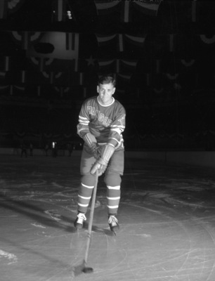 The Fort Worth Rangers are a minor professional ice hockey team in the American Hockey Association (A. H. A.). They are opening the 1941-1942 season against the visiting St. Paul Saints at Will Rogers Memorial Coliseum. Gene Carrigan is the head coach and starting center for the Rangers. He is shown warming-up on the ice, dressed in his hockey uniform. Carrigan is a former professional hockey player with the New York Rangers, Detroit Red Wings, and St. Louis Eagles.