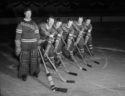 The Fort Worth Rangers are a minor professional ice hockey team in the American Hockey Association (A. H. A.). They are opening the 1941-1942 season against the visiting St. Paul Saints at Will Rogers Memorial Coliseum. The starting combination, left to right, are Jimmy Hill (goalie), Ross Knowles (defense), George Pearson (defense), Lloyd Jackson (center), Pete Leswick (wing), and Pete Pleban (wing). They are dressed in hockey uniforms with the word "Rangers" spelled diagonally across the chest. They are standing on the ice, holding hockey sticks.