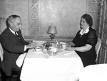 Image shows Before the 75th annual Central Texas Methodist Conference session opening at First Methodist Church, Bishop Ivan Lee Holt (right) has breakfast with his wife in the Westbrook Hotel coffee shop. The couple is sitting at a table with several plates and cups in front of them. Mrs. Holt is looking over at her husband and smiling. Bishop Holt is cutting a piece of food on his plate. He is wearing a suit and his wife is wearing a floral detailed blouse. Published in the Fort Worth Star-Telegram evening edition November 5, 1941.