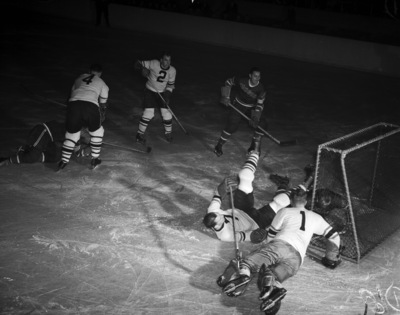 Hockey action Fort Worth Rangers and Saint Paul; Pete Leswick at net; Lloyd Jackson upper left; Benny Grant #1 (Saint Paul) foreground; Verge Johnson #2 and Yank Boyd (Saint Paul); Pete Pleban (Ranger) upper right. The players can be seen wearing their uniforms and playing on the ice.