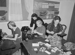Women of the Maplechester Grove Number 5, Woodmen Circle, are devoting one day each week to sewing garments for the American Red Cross. At the machines seated left to right are Mrs. Myrtle V. Holton and Mrs. Beulah Swank. Miss Verna Lawson, instructor, is assisting Mrs. Swank. At the table, at right, is Mrs. Katie Ludiker. They are all wearing dresses. On the table is sewing equipment and a stack of clothing. Star-Telegram Evening Edition November 11, 1941