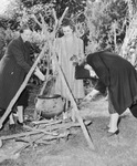 The hominy pot of the Azle Club's exhibit at the Garden Center Fall Festival and, left to right, Mrs. E. L. Scott, Foster Reed and Joe Rider. They are all wearing dresses and coats. Mrs. Scott is wearing eyeglasses and holding a cob of corn. Mrs. Reed is holding a pair of gloves and a purse and is stirring the pot. Behind them are several trees. Star-Telegram Morning Edition November 9, 1941