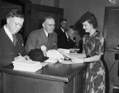 At the Central Texas Methodist Conference were Mrs. Erle Wales Papworth (right), Reverend F. L. Wilshire (center), of De Leon, Texas, and Reverend R. A. Crosby, of Burleson, Texas. The two reverends are standing behind a desk that is covered with stacks of paper. Mrs. Papworth is standing on the other side of the desk, holding a piece of paper. Reverend Crosby is penning a postal card to his son who lives in Canada. Mrs. Papworth is wearing a long, patterned dress and the reverends are dressed in suits. Standing in the background are two unidentified men, one of which is on the phone.