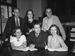 These church leaders met with Reverend Grady Guyton, pastor of the Fort Worth Christian Church Pastors Association, to plan for "Young People's Night" at the citywide revival at First Christian Church. Standing, left to right, are Harold Calhoun, of Arlington Heights Christian Church, Miss Virginia Harding, of Boulevard Christian Church, and Kirk Cansler, of First. Seated at a desk, left to right, are Miss Ida Nell Muir, of Chestnut Avenue Christian Church, Reverend Guyton, pastor at Chestnut Avenue, and Miss Anne Hutton, of University Christian Church. Mr. Calhoun and Reverend Guyton are wearing suits and Mr. Cansler is wearing a collared, striped shirt and a coat. Miss Harding is wearing a dark dress and a multi-strand pearl necklace. She is holding a pencil. Miss Muir is wearing a blouse with a brooch pinned to the collar and is holding a pencil. Miss Hutton is wearing a sweater and a pearl necklace and is holding a pencil. On the desk is a notepad.