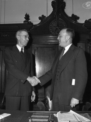 George Conner, left, and Frank Culver Junior. Judge Conner turned back the gavel and bench of Seventeenth District Court to Frank P. Culver, Jr when the latter returned to his job as judge after a year's service with the 36th Artillery Division. Conner returned to private practice.