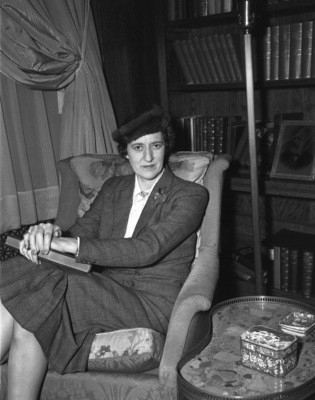 Dorothy Vicaji, English portrait painter, who was a guest in Fort Worth Sunday at a tea given by Mr. and Mrs. D. C. Proctor. Vicaji is sitting on a sofa chair with her legs crossed holding a book on her lap. Image appeared in "Portrait Painter Guest Here,' Star-Telegram Evening Edition February 26, 1940.