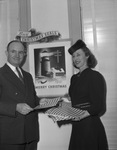 Leaders in the Tuberculosis Society's Christmas seal sale campaign are left to right Arthur J. Doherty and Miss Frances Condit. Mr. Doherty, is president of the Fort Worth-Tarrant County Tuberculosis Society and chairman of the seal sale. He is wearing a double breasted pinstripe suit. Miss Condit, of Austin, Texas is a secretary for the Texas Tuberculosis Association. She is wearing a fur hat and a dress belted at the waist. They are holding the stamps as the discuss ways to make the 1941 sale break all previous records in Fort Worth, Texas.