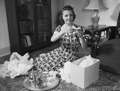 Visiting with Fort Worth brides. Their hobbies, recreation, duties. When one is a bride, there’s so much to learn about organizing the household tasks, cooking and being a “little housewife†that it keeps a girl plenty busy, Mrs. Carl Gibbe, is finding out. Dr. and Mrs. Gibbe, married here October 4, are established in an apartment after a trip to Mexico. Mrs. Gibbe has the thrill that comes to every bride when she opens wedding gifts and explores the hidden recesses of beautiful packages. Mrs. Gibbe is shown smiling in her living room, as she opens a package containing a silver tea set. Published in The Fort Worth Star-Telegram Morning Edition November 30, 1941.