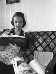 Visiting with Fort Worth brides. Their hobbies, recreation, duties. Mrs. Carl Gibbe, is finding out when one is a bride, there’s so much to learn about organizing the household tasks, cooking and being a “little housewife†that it keeps a girl plenty busy, Mrs. Carl Gibbe, is finding out. Dr. and Mrs. Gibbe, married here October 4, are established in an apartment after a trip to Mexico. In this photograph Mrs. Gibbe is shown curled up on a sofa reading a cook book in order to make out some menus. She appears to be biting down on a pencil she holds with her other hand. Mrs. Gibbes is wearing a dark dress with a patterned apron on top. Published in The Fort Worth Star-Telegram Morning Edition November 30, 1941.