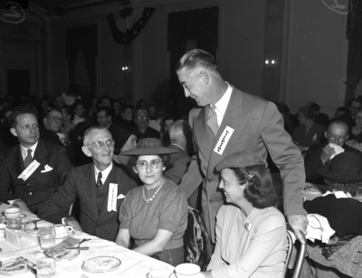 The West Texas Chamber of Commerce (W. T. C. C.) is holding their fall convention in Midland, Texas. Delegates from Fort Worth, Texas, had a busy schedule, beginning with their arrival at the opening day parade and concluding with the "All Out West Texas" banquet. Attending the banquet, left to right, are Mr. and Mrs. H. H. Wilkinson and Mr. and Mrs. Ralph Geisler. Mr. Wilkinson is dressed in a three-piece pinstripe suit. Mrs. Wilkinson is wearing a hat, button-up blouse, and a necklace. Mr. Geisler is dressed in a double breasted suit. Mrs. Geisler is wearing a hat and a sweater.