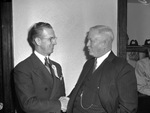 The West Texas Chamber of Commerce (W. T. C. C.) is holding their fall convention in Midland, Texas. The "All Out West Texas" banquet and defense rally is being held at the Scharbauer Hotel. In attendance, left to right, are L. A. Wilson and Dan E. Lydick. Mr. Wilson, of Waco, Texas, is the manager of the Waco Chamber of Commerce. He is being congratulated for winning the bid for the 1942 convention. He is dressed in a double breasted suit. Mr. Lydick, of Fort Worth, Texas, is president of the Union Bank and Trust company. He is wearing a three-piece pinstripe suit.