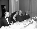 The West Texas Chamber of Commerce (W. T. C. C.) is holding their fall convention in Midland, Texas. The "All Out West Texas" banquet and defense rally is being held at the Scharbauer Hotel. In attendance, left to right, are Dr. Clifford B. Jones, Mrs. Clifford B. Jones, James D. Hamlin and H. S. Hilburn. Dr. Jones is president of Texas Technological College at Lubbock, Texas, and is the principal speaker at the banquet. He is wearing a suit with a bow tie. Mrs. Jones is wearing a dark dress with a bow shaped brooch. Mr. Hamlin, of Farwell, Texas, is a W. T. C. C. past president and now chairman of the convention work committee. He is wearing a three-piece suit. Mr. Hilburn, of Plainview, Texas, is also a past president and now a delegate-at-large. He is wearing a double breasted pinstripe suit.