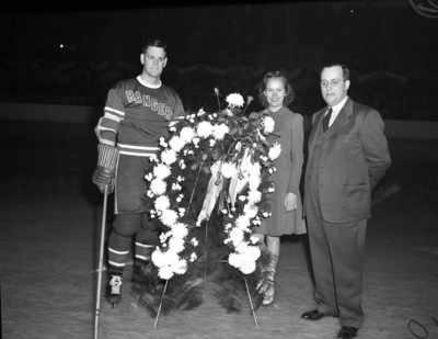 The 1941-1942 American Hockey Association (A. H. A.) season is opening at Will Rogers Memorial Coliseum with a match between the Fort Worth Rangers and the visiting St. Paul Saints. At center ice during the pregame ceremony, left to right, are Manager Gene Carrigan, Mary Louise Ballard, and Sam Buron. They are shown with a floral tribute presented by the Saints. Carrigan is the coach of the Rangers and also plays center. He is dressed in a hockey uniform. Miss Ballard carried the flowers onto the ice. She is wearing a dress and skates. Mr. Buron is the owner of the Rangers. He is dressed in a three-piece suit.