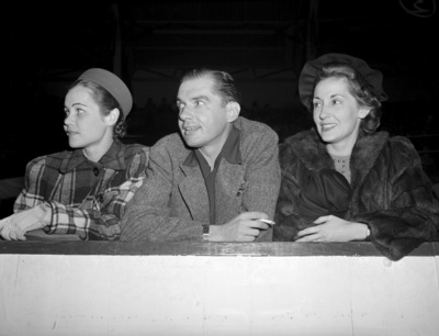 The 1941-1942 American Hockey Association (A. H. A.) season is opening at Will Rogers Memorial Coliseum with a match between the Fort Worth Rangers and the visiting St. Paul Saints. Attending the game, left to right, are Mrs. Charles Burton, Charles Burton, and Mrs J. Laurence Coulter, all of Dallas, Texas. Mrs. Burton is wearing a hat and a plaid coat. Mr. Burton is the sports editor with the Dallas Morning News. He is dressed in a collared shirt and a blazer. Mrs. Coulter is wearing a hat and a fur coat. The trio's home team, the Dallas Texans, will open their season tomorrow night against the Saints.