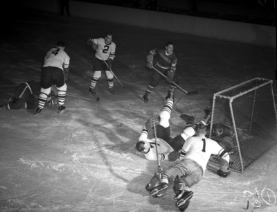 The 1941-1942 American Hockey Association (A. H. A.) season is opening at Will Rogers Memorial Coliseum with a match between the Fort Worth Rangers and the visiting St. Paul Saints (white jerseys). The teams are shown in action on the ice. Pete Leswick, wing for the Rangers, is barely visible in the net after taking a shot from Lloyd Jackson. Jackson, the Rangers' center, is shown on his knees at upper left, after passing to his teammate. The Ranger at the upper right is wing Pete Pleban. The Saints are Gord Reid (4), Benny Grant (1), Virgil Johnson (2) and Yank Boyd (7).