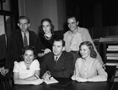 These church leaders met with Reverend Grady Guyton, pastor of the Fort Worth Christian Church Pastors Association, to plan for "Young People's Night" at the citywide revival at First Christian Church. Standing, left to right, are Harold Calhoun, of Arlington Heights Christian Church, Miss Virginia Harding, of Boulevard Christian Church, and Kirk Cansler, of First. Seated at a desk, left to right, are Miss Ida Nell Muir, of Chestnut Avenue Christian Church, Reverend Guyton, pastor at Chestnut Avenue, and Miss Anne Hutton, of University Christian Church. Mr. Calhoun and Reverend Guyton are wearing suits and Mr. Cansler is wearing a collared, striped shirt and a coat. Miss Harding is wearing a dark dress and a multi-strand pearl necklace. She is holding a pencil. Miss Muir is wearing a blouse with a brooch pinned to the collar and is holding a pencil. Miss Hutton is wearing a sweater and a pearl necklace and is holding a pencil. On the desk is a notepad.