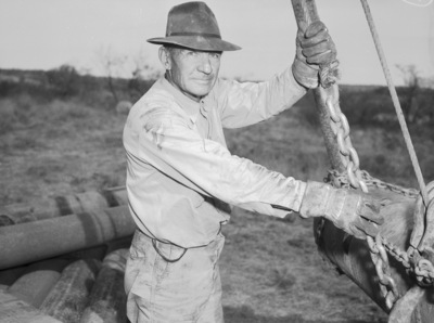 A. B. Bissey, drilling contractor for Burk Royalty Company. He is standing outside, wearing a shirt, trousers, hat and gloves and is working on a piece of machinery. Star-Telegram Morning Edition November 9, 1941