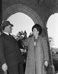 Mrs. C. A. Sutton (right) flicks a speck off the coat lapel of her husband, president of Weatherford College, Weatherford, Texas, as they prepare to enter First Methodist Church in Fort Worth, Texas, for the Central Texas Methodist Conference session. Mrs. Sutton is wearing a long, textured coat and a hat. She is holding a handbag in her left hand. Dr. Sutton is wearing a suit, a hat and eyeglasses.