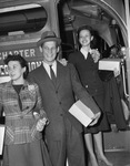 Little Theater. Group to go to Mineral Wells, Texas. Left to right, Miss Dulcy Ditmore, David Philips and Sally Carmichael, entering bus.