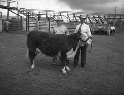 William Hendry, left, manager of Jinkins Hereford Ranch, and D. W. Williams, head of Texas Agricultural and Mechanical College's animal husbandry department, shown with a Jinkins Hereford heifer.