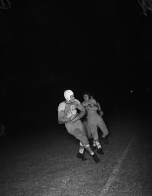 A high school football game between the Masonic Home and the Paschal Panthers is being held at Farrington Field in Fort Worth, Texas. During the second quarter of the Thursday night game, blocking back Dewitt Coulter (8) ran to the end zone. He is being covered by Panther Jerry Sullivan (63). Mason Gordy Brown threw a twenty-seven yard pass and connected with Coulter for the touchdown. The score gave the Masons a 13-0 lead. Three young men are featured in the photo, in football uniforms on a grassy field with a chalked line to the right. They're wearing leather helmets and the young ma in front is carrying the ball. Coulter is wearing what appear to be tape bandages on his calves, and Sullivan, next to him, appears to have shin guards taped to his lower legs. "(Star-Telegram Photo by Tom Dillard.)" Published Star-Telegram Morn. Nov. 7, 1941.