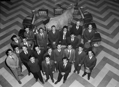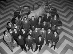 Engineering students from University of Texas, on an inspection tour of Fort Worth industries, spent several hours at the Municipal Airport. Here they are examining a triple recorder in the Weather Bureau office. They are all wearing suits. Published in Fort Worth Star-Telegram, morning edition, November 7, 1941.