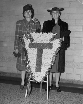 Mrs. A. S. Whitley, left, and Mrs. A. N. Husley, the first president of the Women's Auxiliary to the wartime 36th. Both women were members of the World War 36th auxiliary. The two women are departing for Washington D.C. so that they may lay the flower replica of the division insignia on the tomb of the unknown soldier in Arlington Cemetery on Armistice Day. They are shown with the flower replica of the division insignia.