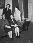 A celebration of the completion of their new club building was held by members of the Twentieth Century Club at Weatherford, Texas. Club officers are pictured in the club building library. They are, left to right, seated, Mrs. A. E. Zellers and Mrs. Ruby Frantz, and, standing, Mrs. Frank Dore and Mrs. Herschel Nash. Mrs. Zellers and Mrs. Frantz are sitting on a couch and Mrs. Dore and Mrs. Nash are standing behind them. Mrs. Nash is leaning on the couch armrest. Mrs. Dore and Mrs. Nash are both wearing overcoats and eyeglasses. Mrs. Zellers and Mrs. Frantz are both wearing dresses and striped blazers and they each have a book in their lap.