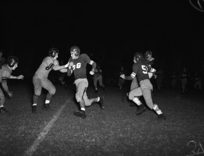 A high school football game between the North Side Steers (dark jerseys) and the Polytechnic Parrots is being played at Farrington Field in Fort Worth, Texas. On the first play from scrimmage, the Steers gave the ball to back Bobby Putnam (51). He is shown at the beginning of his run, breaking around his left end. Leading the way with a block is tackle John Utley (56). He is lowering his shoulder to block Parrot halfback Kenneth Peacock. Putnam galloped seventy-six yards and scored a touchdown. Despite the early score, the Steers lost to the Parrots 18-7. "(Star-Telegram Photos by Tom Dillard.)" Published Star-Telegram Morn. Nov. 8, 1941.