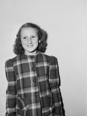 Betty Jane Wilburn, a Birthday Club member, who will celebrate her ninth anniversary Sunday, Nov. 23, 1941. She is the daughter of Mr. and Mrs. R. H. Wilburn, 317 Judkins St., Fort Worth, TX. Published evening edition, Fort Wort Star-Telegram Nov. 22, 1941. Female child dressed in a plaid jacket with four dark buttons and two pockets at the waist.