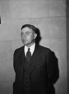 Reverend F. H. Ingram, pastor at Rockwood, Texas, in the Brownwood, Texas, district, was reassigned to the Methodist church at Haslet, Texas, during the closing session of the Central Texas Methodist Conference. He is standing in front of a blank wall, wearing a three-piece suit and a pair of glasses. He is looking off to his right and standing with his hands behind his back.