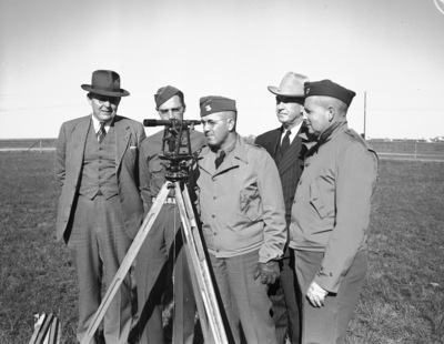 Soldiers of the 142nd Infantry, 36th Division pitched a camp for 3,000 men just west of Fort Worth Sunday afternoon for an Armistice Day Celebration. An advance detail from Camp Bowie and Fort Worth Armistice Day committeemen as they laid out the camp site. Peering through the transit is Major Charles H. Dobbs, commanding officer of the 1st Battalion of the 142nd Infantry. Others in the photo are, left to right, Harry Laue, arrangements committeeman; Private Jack Ellis; C. M. O' Brian, parade committeeman; and Captain Andy Price, regimental adjutant.