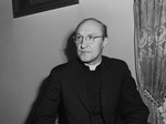 Americans from Europe voice stern hope on Armistice Day. Reverend Ernest Langenhorst, Holland, seen in a suit and priest collar around his neck, as he sits in front of a curtain. He is the Reverend at St. Patrick's Catholic Church. He said "We all ought to feel embarrassed on this Armistice Day. When the documents were signed on Nov. 11, 1918, in the forest of Compeigne we felt it should end, not only that war, but all such useless, brutal, inhuman slaughter. But we didn't watch, and we allowed justice and love once more to be banished from international relationships."